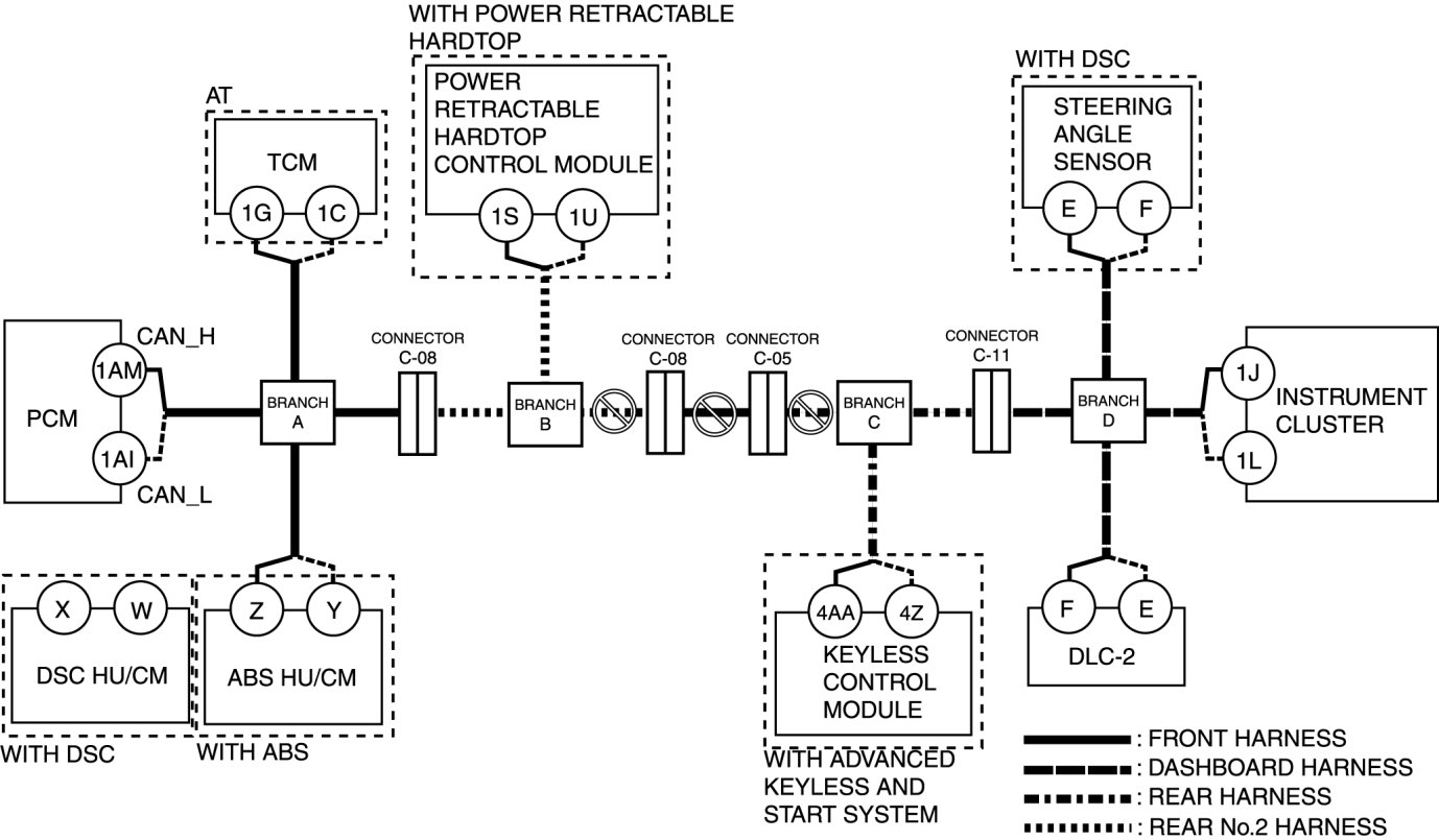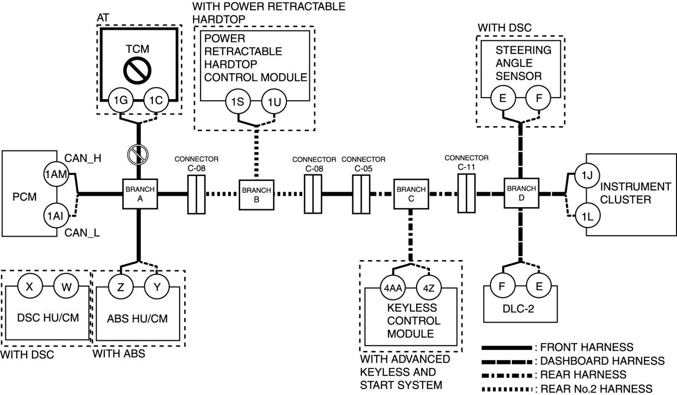 - Wiring harness between keyless control module terminal 4Z and branch C