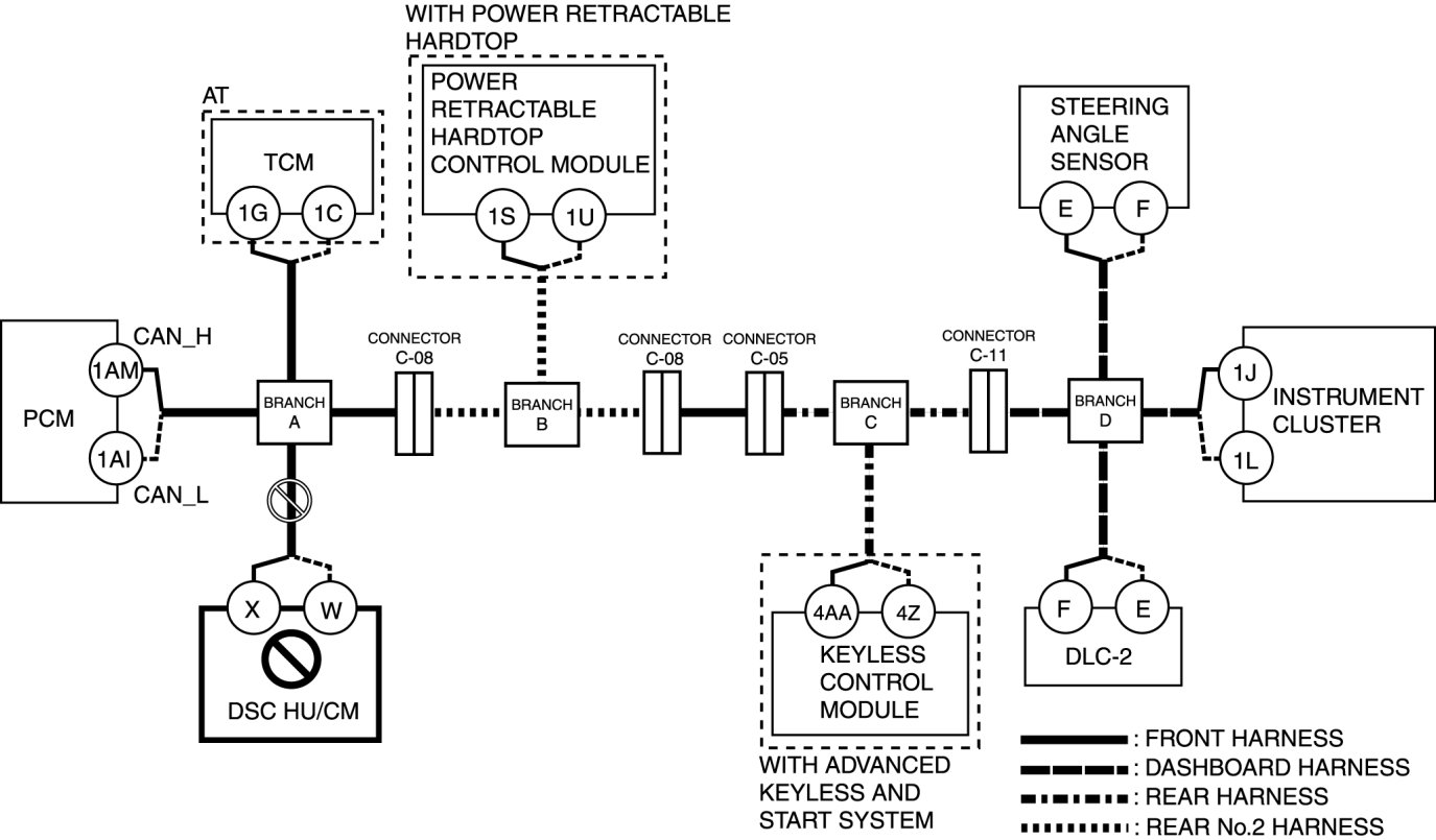 - Wiring harness between keyless control module terminal 4AA and branch C