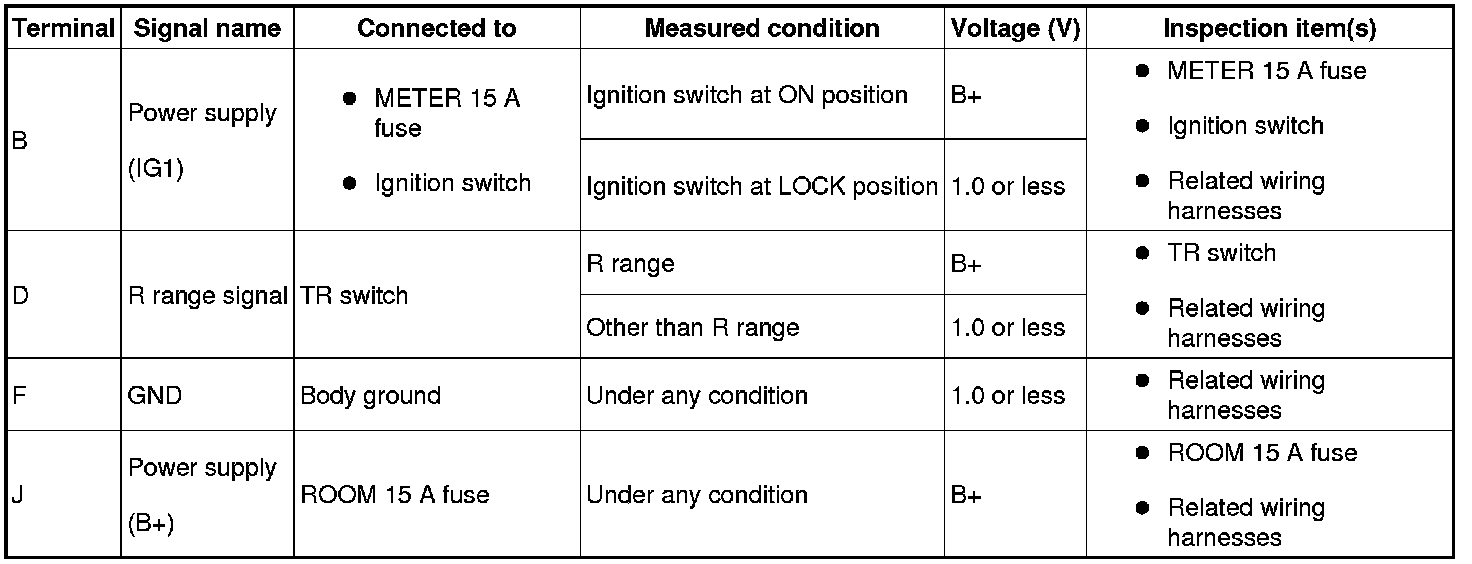 - If the voltage is not as specified in the Terminal Voltage Table (Reference), inspect the parts under "Inspection item(s)" and related wiring harnesses.