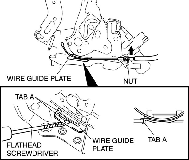 7. Remove tabs A using a tape-wrapped flathead screwdriver, and then remove the wire guide plate.