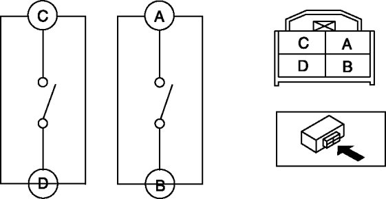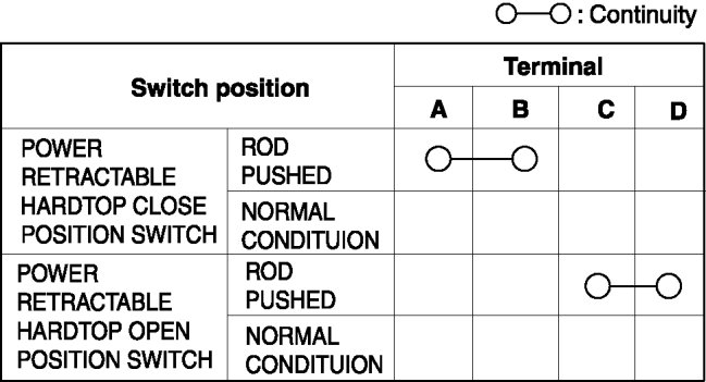 1. Verify that the continuity between the power retractable hardtop limit switch terminals is as indicated in the table.