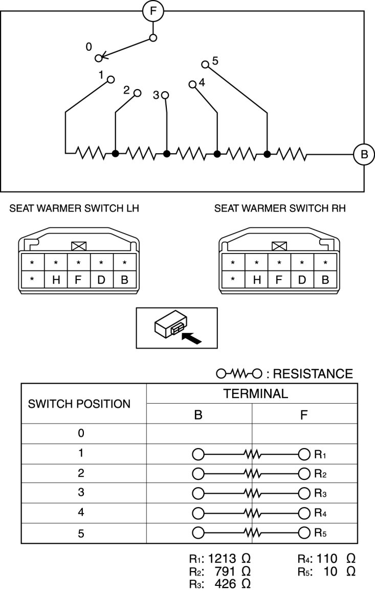 Inspect for resistance and continuity between the seat warmer switch terminals using a tester.