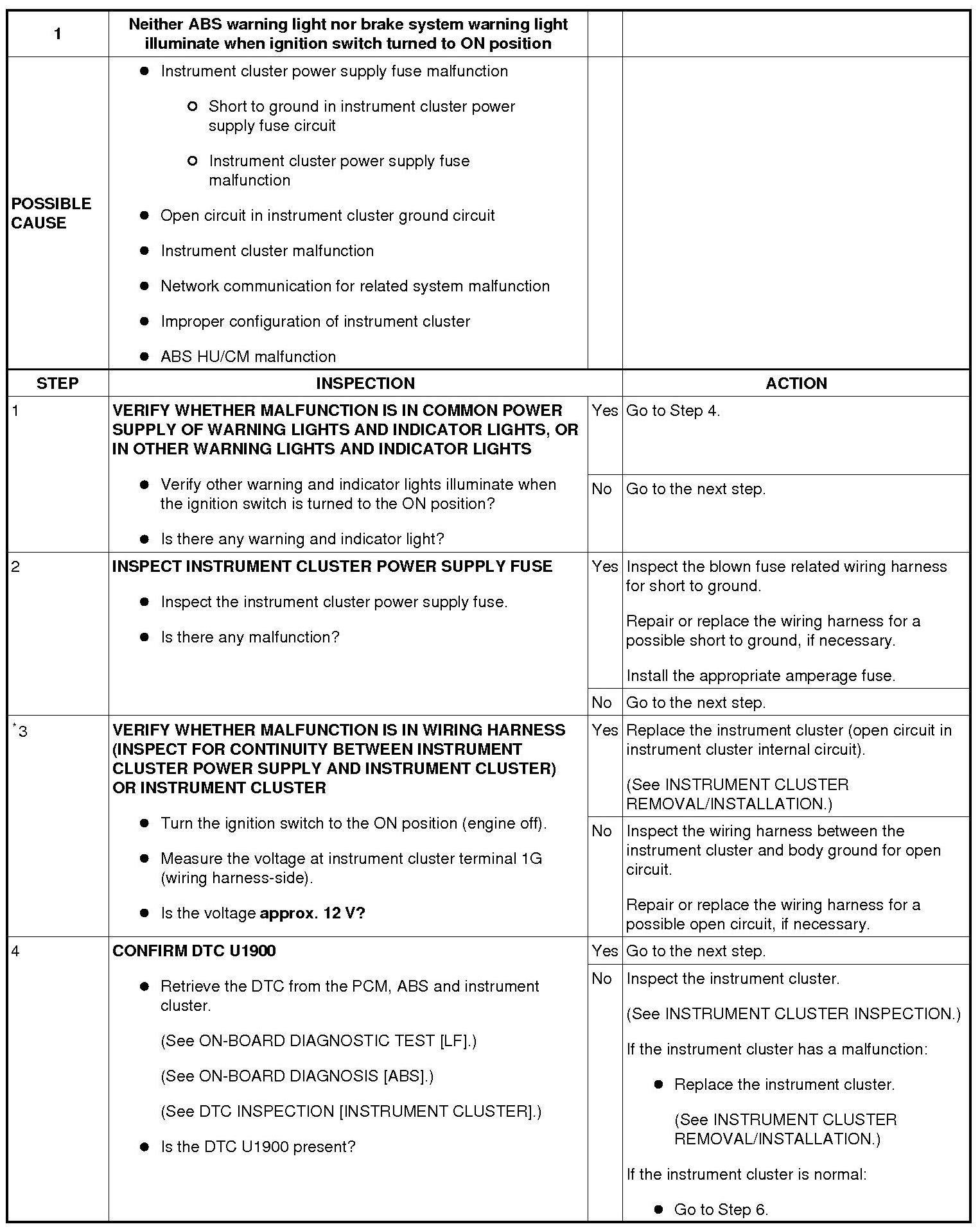 No. 1 Neither ABS Warning Light Nor Brake System Warning Light Illuminate When Ignition Switch Turned To ON Position