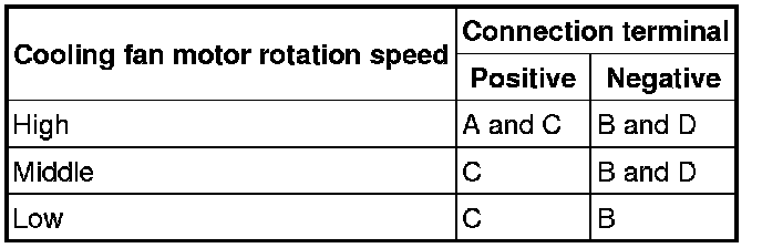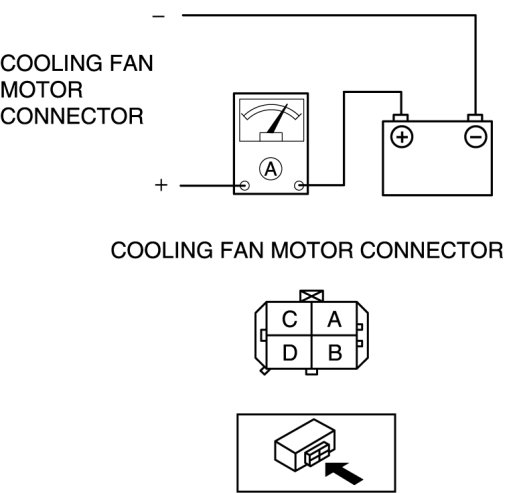 2. Install a tester and battery to the cooling fan motor connector (4 terminals) as shown in the figure.