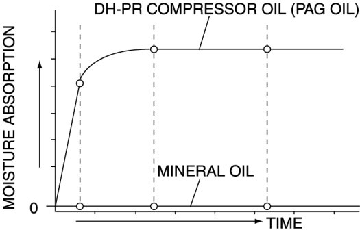 - DH-PR compressor oil (PAG oil) has a higher moisture absorption efficiency than the previously used mineral oil. If moisture mixes with the compressor oil, the refrigerant system could be damaged. Therefore, install caps immediately after using the compressor oil or removing refrigerant system parts to prevent moisture absorption.