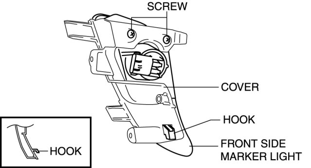 8. Set aside the hook and remove the cover from the front side marker light after removing the screws shown in the figure.