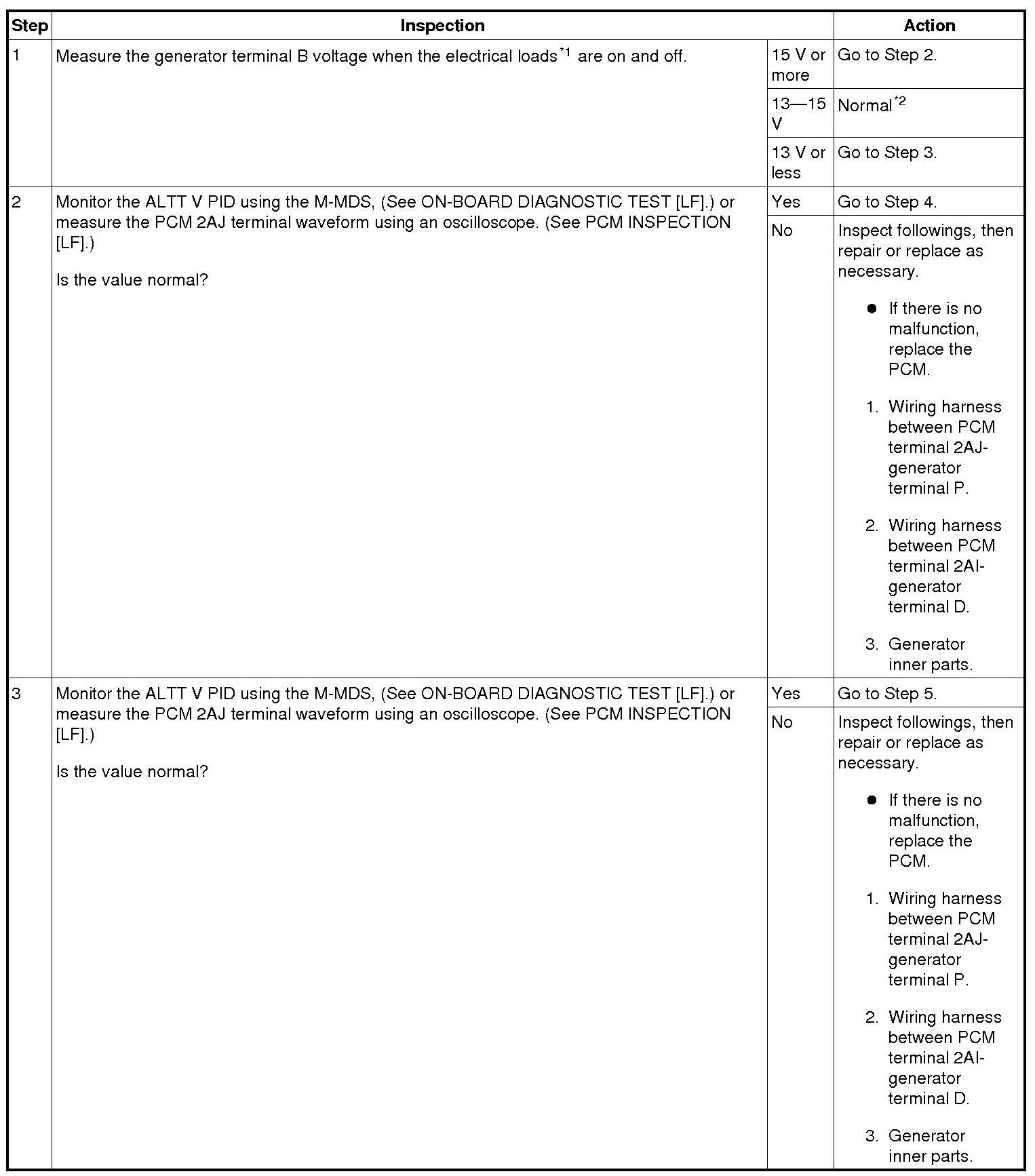 1 When the electrical load on the vehicle is low, the specified current cannot be verified although the generator is normal. In this case, increase the electrical load (Leave the headlights turned on for a while, then discharge the battery, or use a similar method.) and recheck.