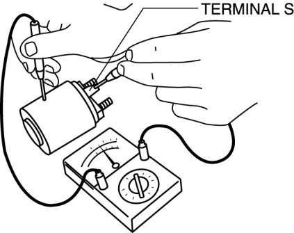1. Verify that the starter motor pinion is extended while battery positive voltage is connected to terminal S and the starter body is grounded.