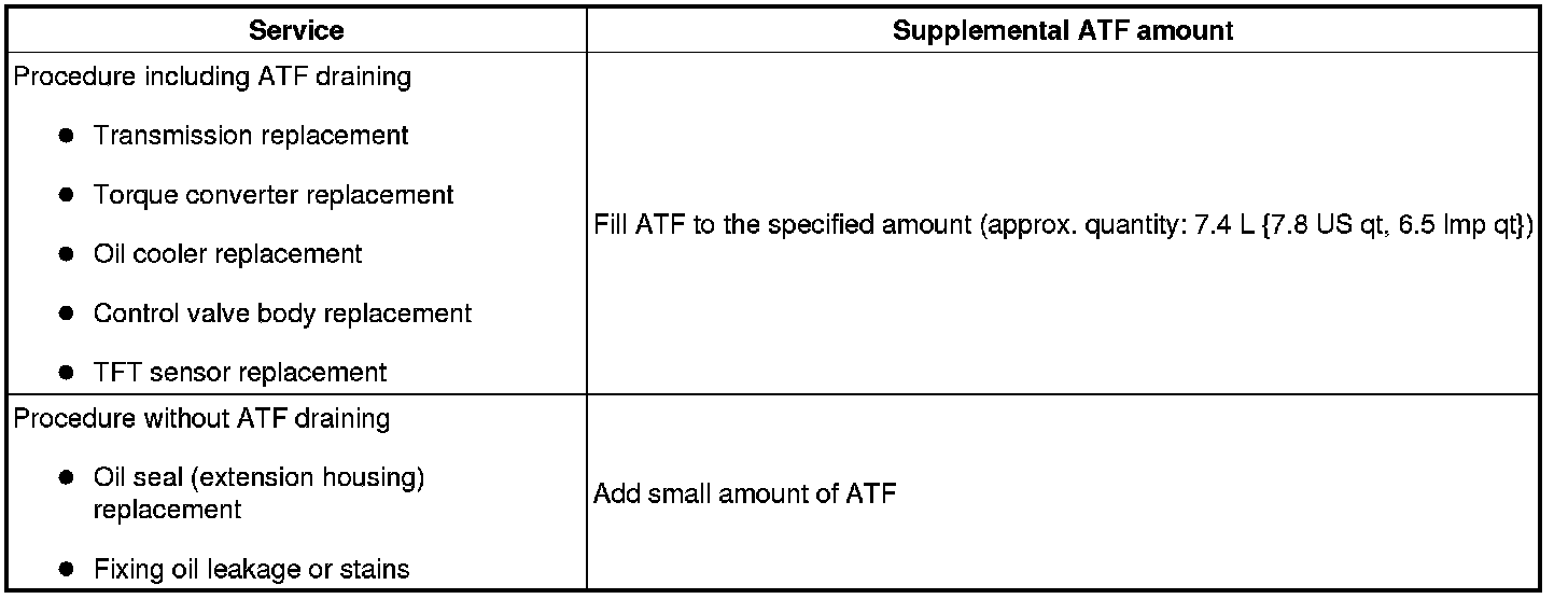 - The ATF level cannot be adjusted correctly if the ATF temperature is not within a normal range (50-60 °C {122-140 °F}). Always perform the servicing according to the adjustment procedure.