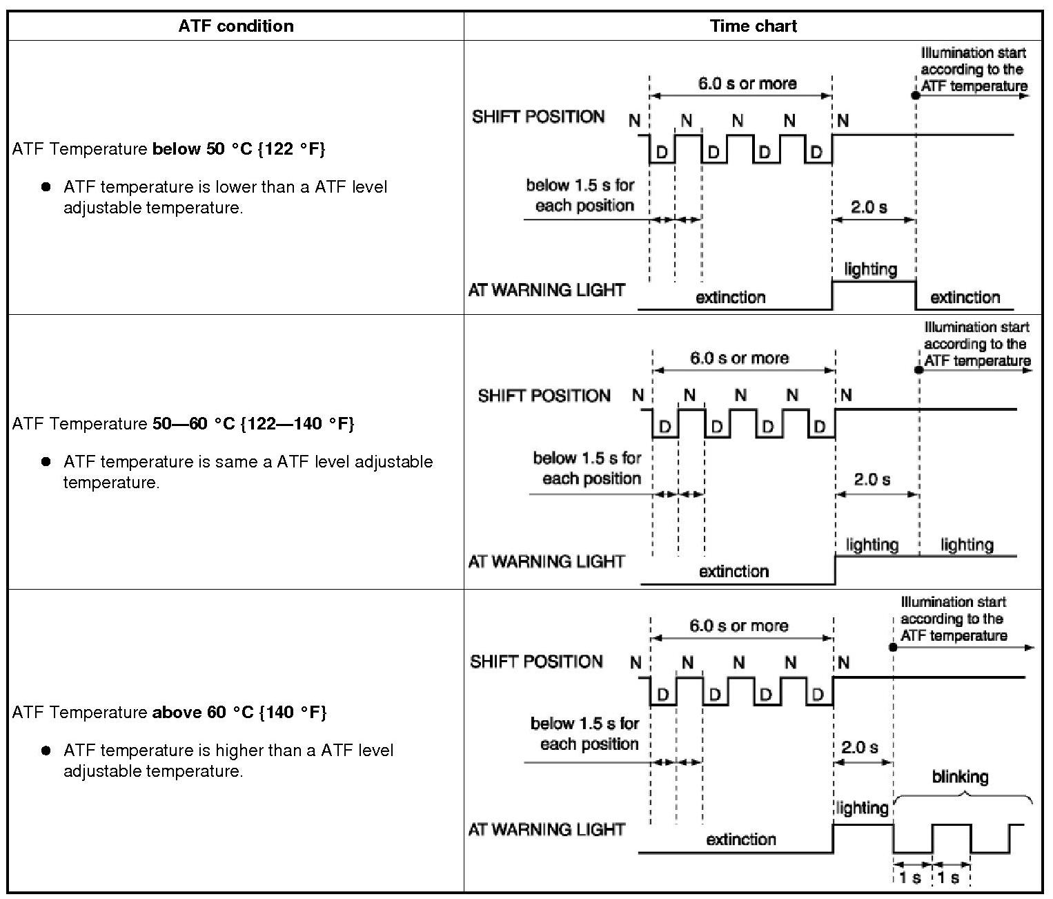 - Continue the shifting operation from N to D, D to N within 1.5 s until the AT warning light illuminates.