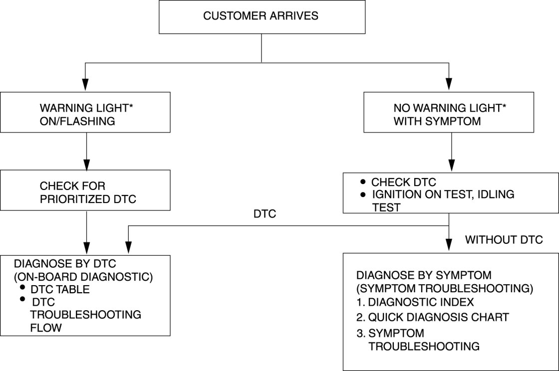 - When the customer reports vehicle malfunction, check the malfunction indicator lamp (MIL) indication, AT warning indication, and diagnostic trouble code (DTC), then diagnose the malfunction according to following flowchart.