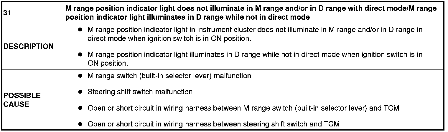 No. 31 M Range Position Indicator Light Does Not Illuminate In M Range And/Or In D Range