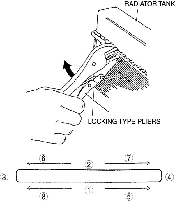 4. Squeeze the header tabs down in the order as shown in the figure against the lip of the radiator outer tank base with the locking-type pliers while rotating the pliers toward the tank.