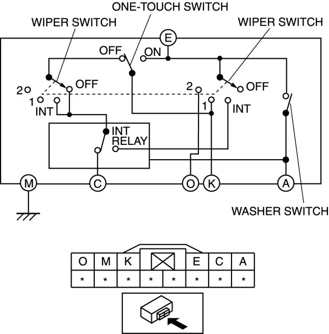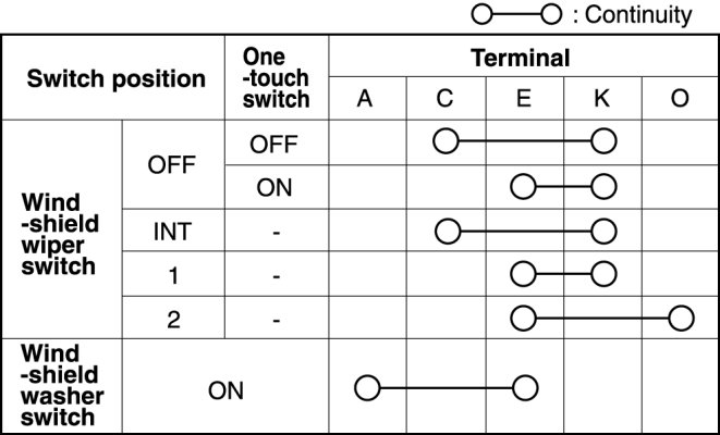 1. Verify that the continuity between the wiper and washer switch is as indicated in the table.