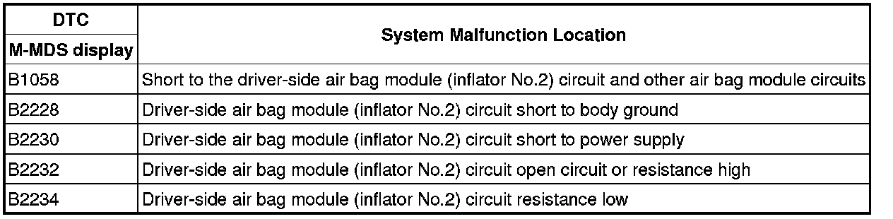 - Abnormal resistance (other than 1.61-5.77 ohms) detected in the driver-side air bag module (inflator No.2) circuit