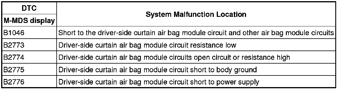 - Resistance other than 1.10-9.64 ohms detected in driver-side curtain air bag module circuit