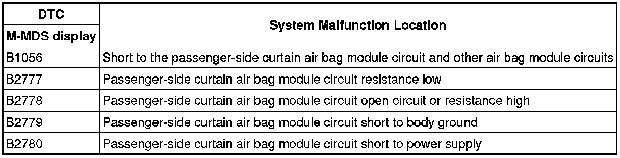 - Resistance other than 1.10-9.64 ohms detected in passenger-side curtain air bag module circuit