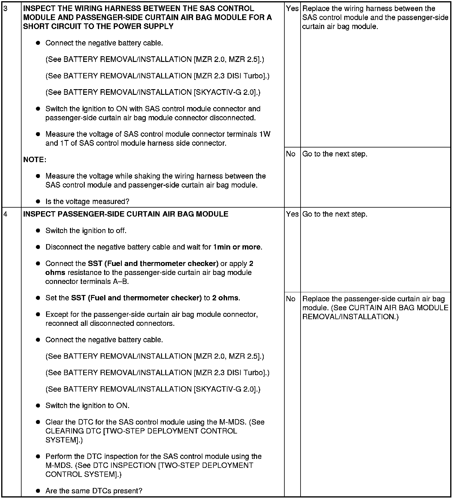 - Open or short circuit or short to ground or short to power supply in the wiring harness between the passenger-side curtain air bag module and SAS control module