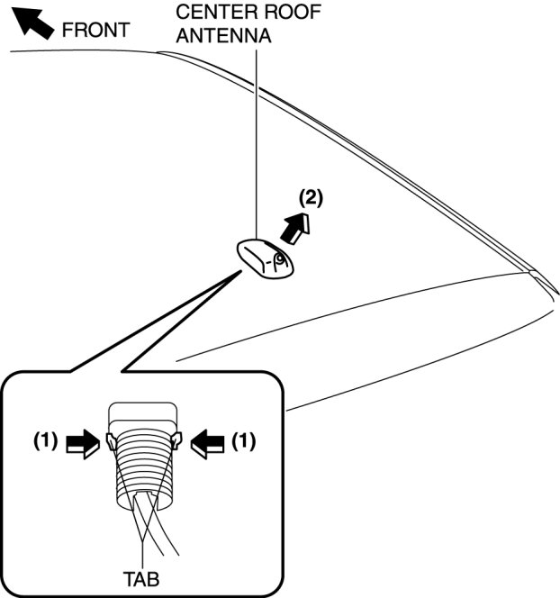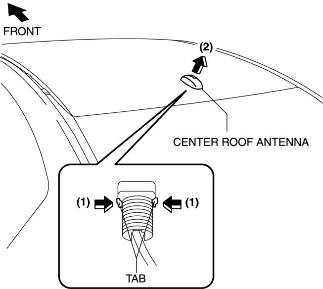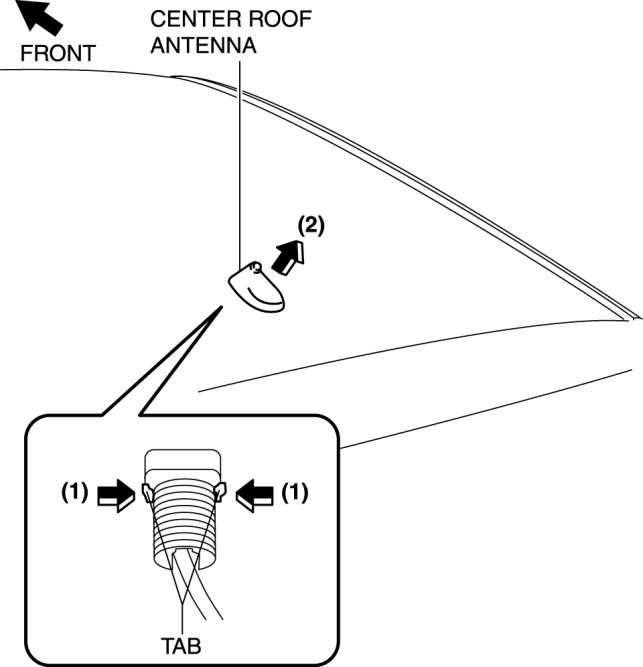 8. Remove the center roof antenna in the direction of the arrow (2) shown in the figure while pressing the center roof antenna tabs in the direction of the arrow (1).