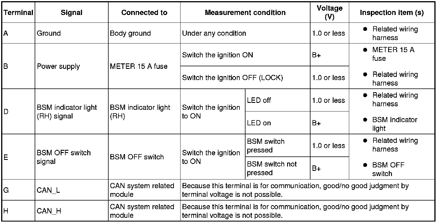 - If the voltage or continuity is not as specified in the Terminal Voltage Table, inspect the parts under "Inspection item (s)".
