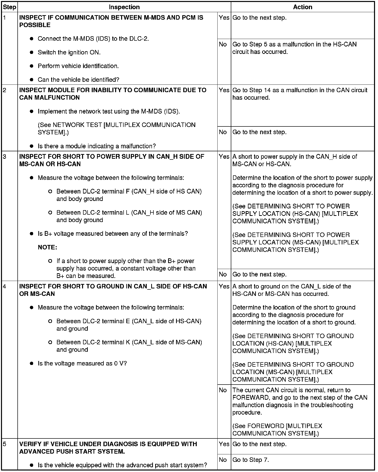- If there is any vehicle malfunction complaint lodged by a customer, refer to " Initial Inspection and Diagnostic Overview" and perform CAN malfunction diagnosis following the steps in the troubleshooting procedure.