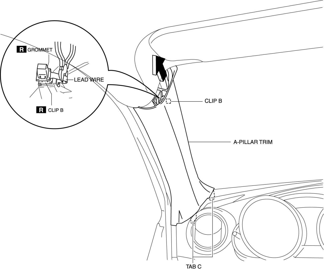 - When pulling out the A-pillar trim, be careful not to damage the tabs C.