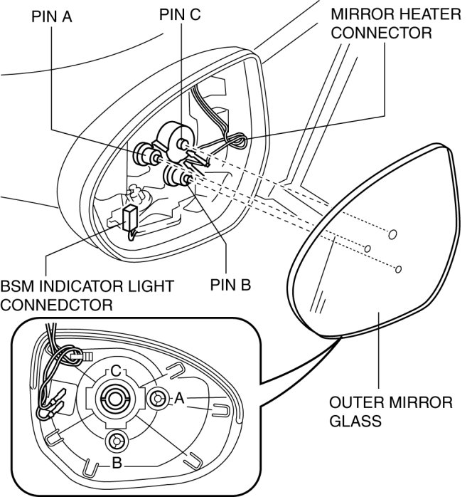 4. Pull the mirror glass holder and remove pins A and C.