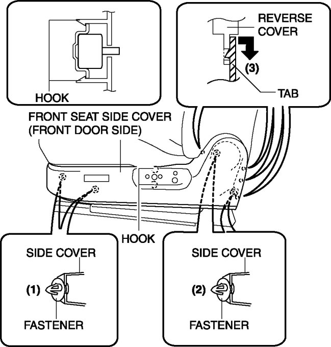 6. Pull the side cover (front door side) in the order of (1), (2), (3) shown in the figure to disengage the fastener, hook and tab.