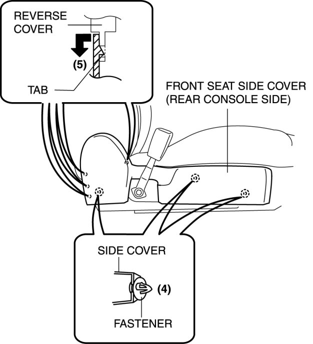8. Pull the side cover (rear console side) in the order of (4), (5) shown in the figure to disengage the fastener and tab.