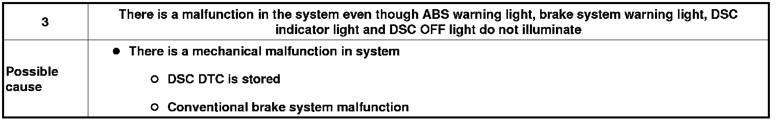 NO.3 THERE IS A MALFUNCTION IN THE SYSTEM EVEN THOUGH ABS WARNING LIGHT, BRAKE SYSTEM WARNING LIGHT, DSC INDICATOR LIGHT AND DSC OFF LIGHT DO NOT ILLUMINATE [DYNAMIC STABILITY CONTROL (DSC)]