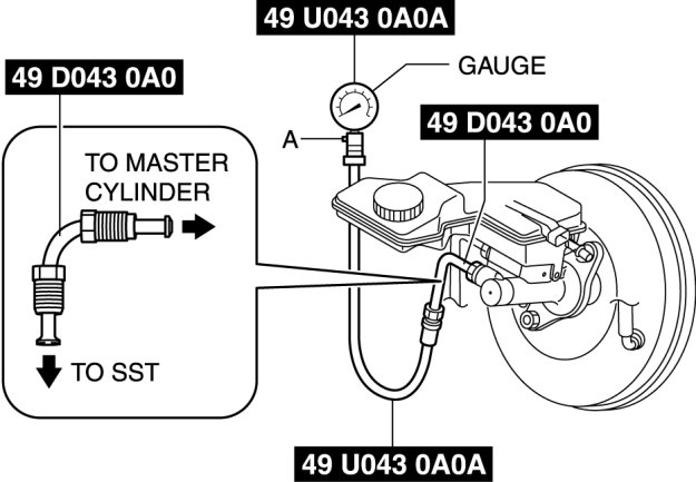 - When installing the SST (49 D043 0A0) to the master cylinder, use a commercially available flare nut wrench (flare nut across flat 12 mm {0.47 in}).