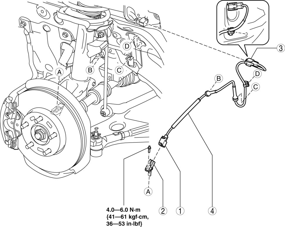 3. After installation, verify that there is no twisting in the front ABS wheel-speed sensor.