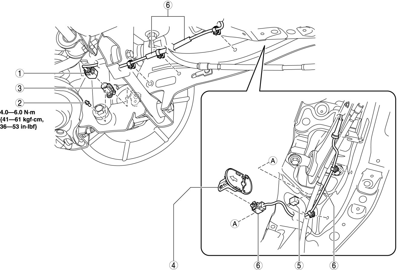1. Pass the rear ABS wheel-speed sensor wiring harness outside the rear parking brake cable as shown in the figure.