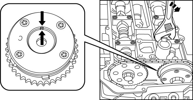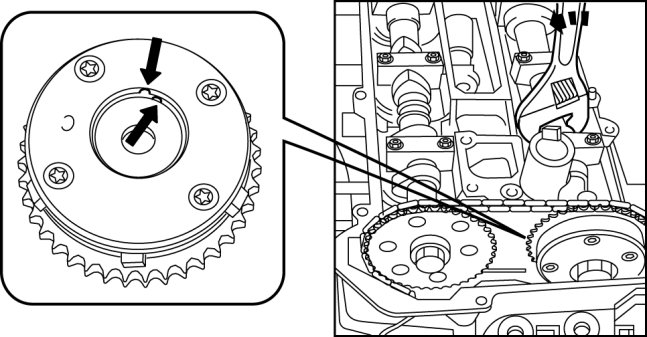 9. Turn the camshaft counterclockwise to align the notches on the variable valve timing actuator.