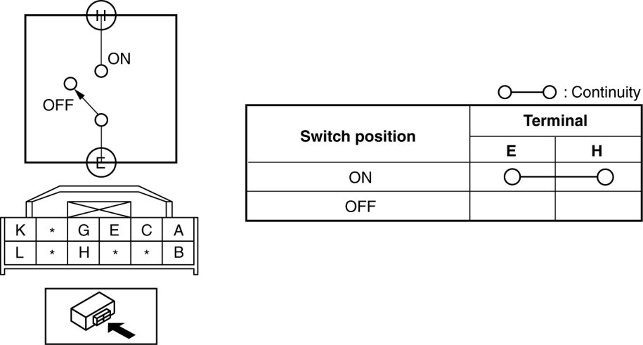 4. Verify that the continuity between the front fog light switch terminals is as indicated in the table.