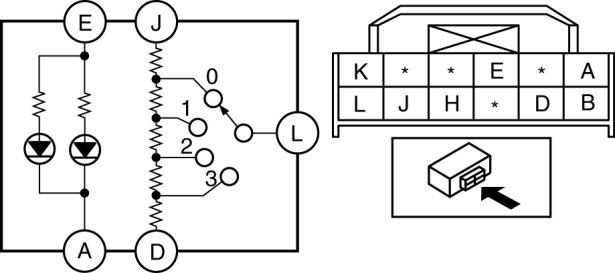 3. Verify that the resistance and continuity between the headlight leveling switch terminals is as indicated in the table.