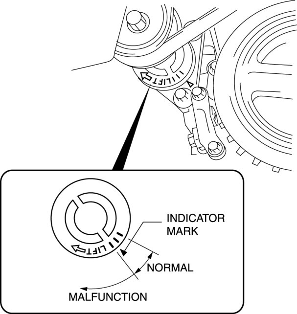 1. Verify that the drive belt auto tensioner indicator mark does not exceed the limit.