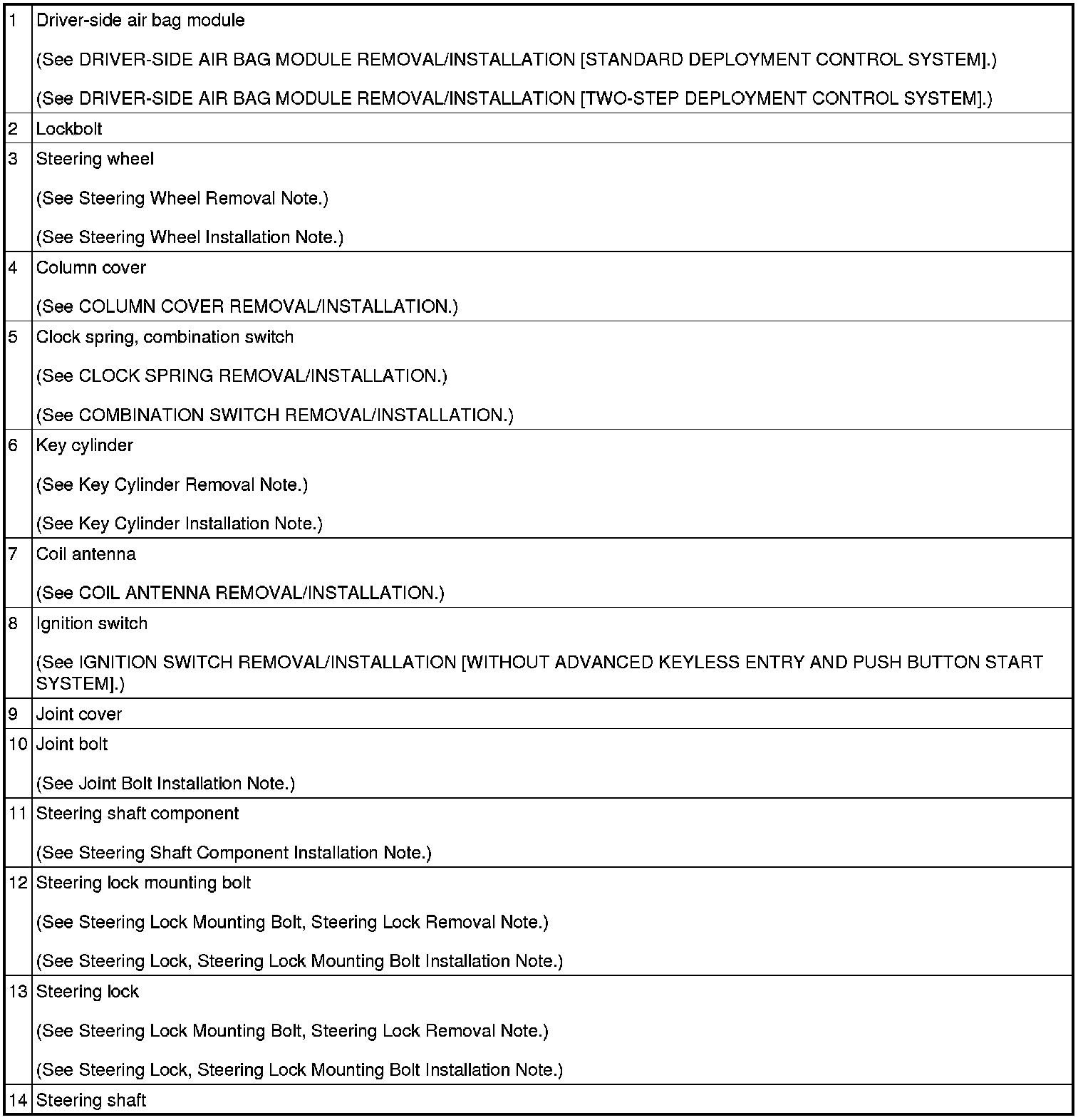 STEERING WHEEL AND COLUMN REMOVAL/INSTALLATION [WITHOUT ADVANCED KEYLESS ENTRY AND PUSH BUTTON START SYSTEM]