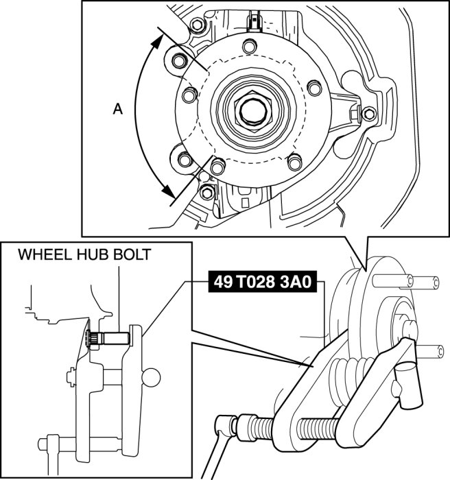 - When removing the wheel hub bolts, perform the work between range A shown in the figure to assure a space for the bolt removal.