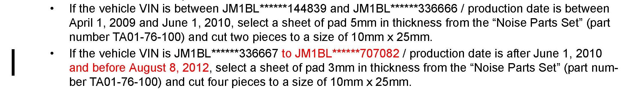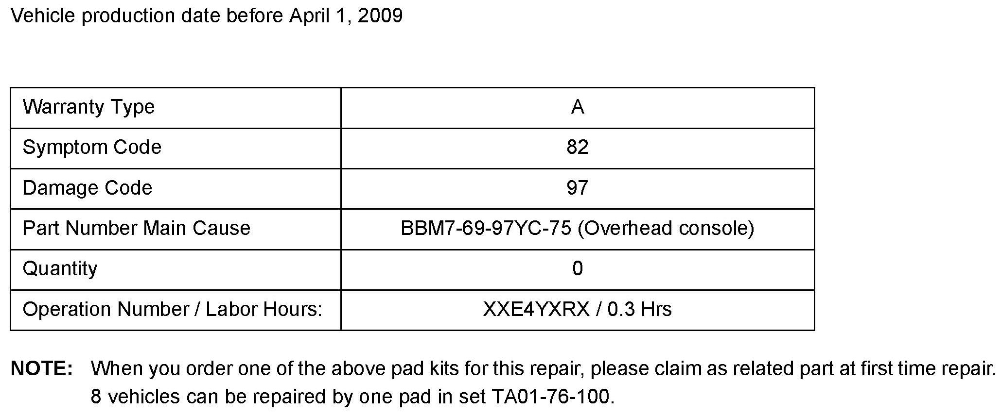 ^ This repair will be covered under Mazda's New Vehicle Limited Warranty term. Additional diagnostic time cannot be claimed for this repair.