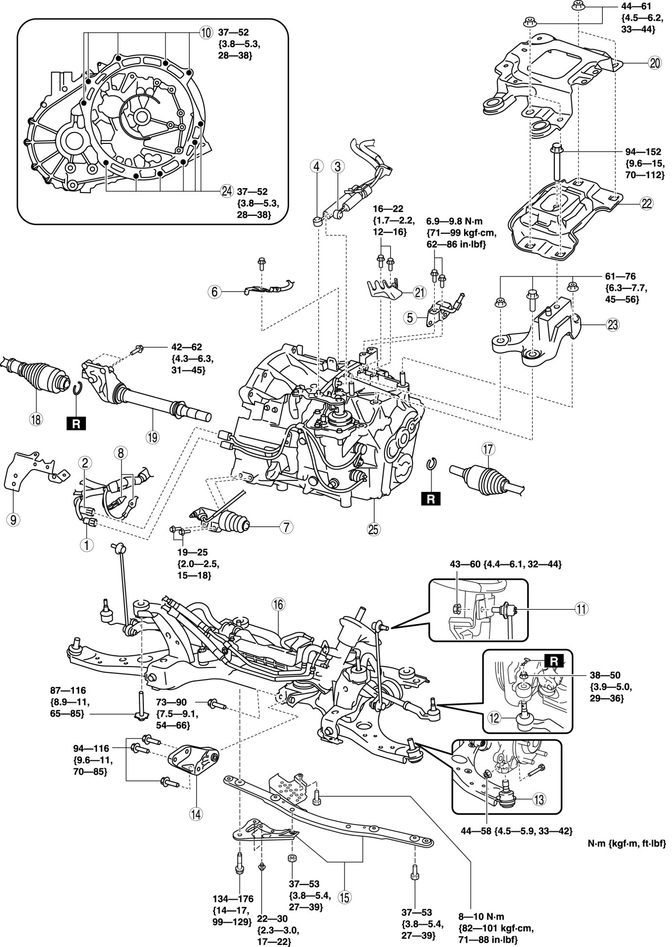 - 94-152 Nm {9.6-15 kgf-m, 70-112 ft-lbf}