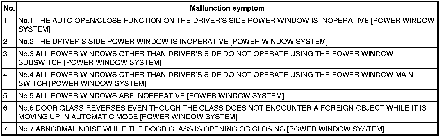 SYMPTOM TROUBLESHOOTING CHART [POWER WINDOW SYSTEM]