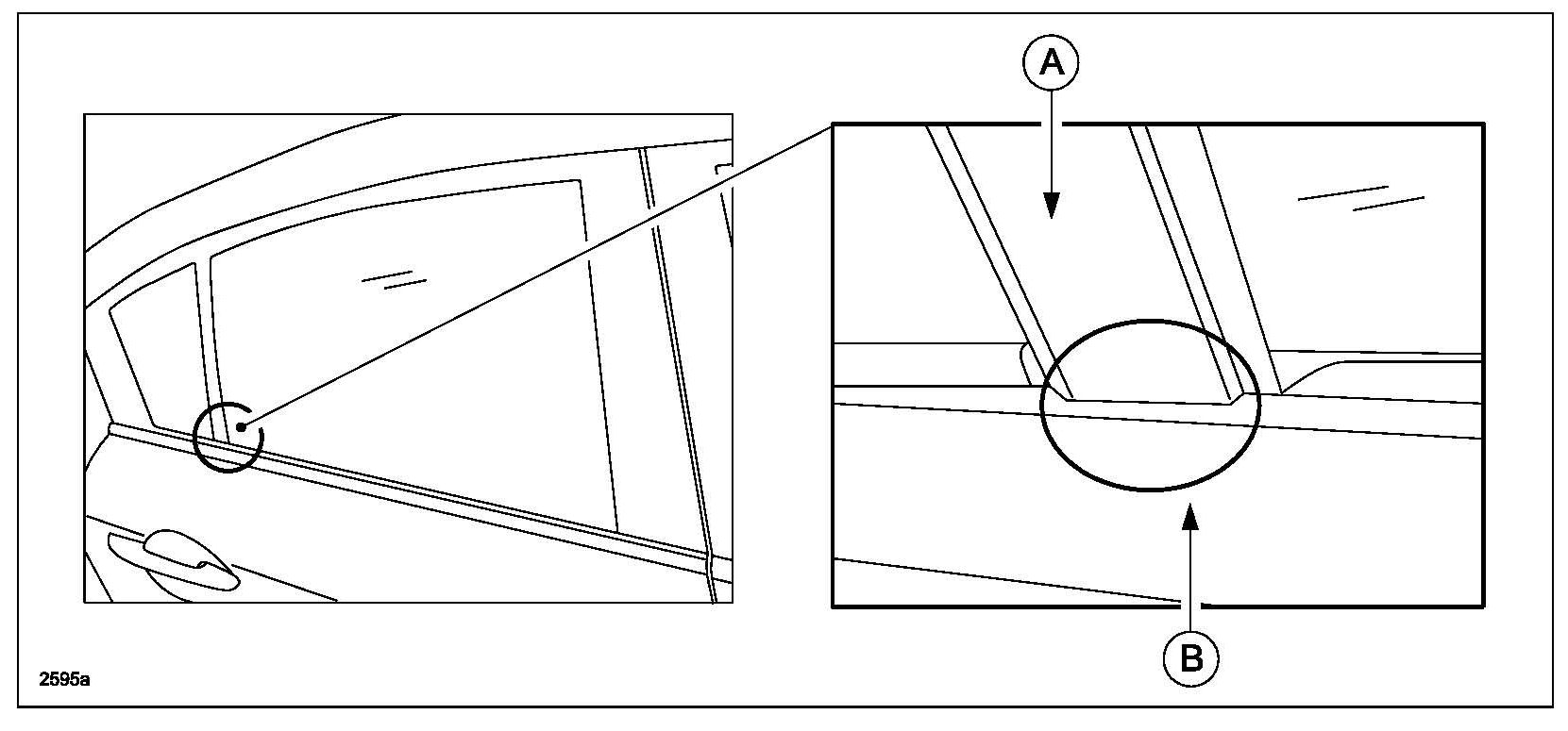 Some vehicles may exhibit rust on the bottom of the rear door glass guide (A) from contact with the rear beltline molding (B). This is caused by a vibration while driving.
