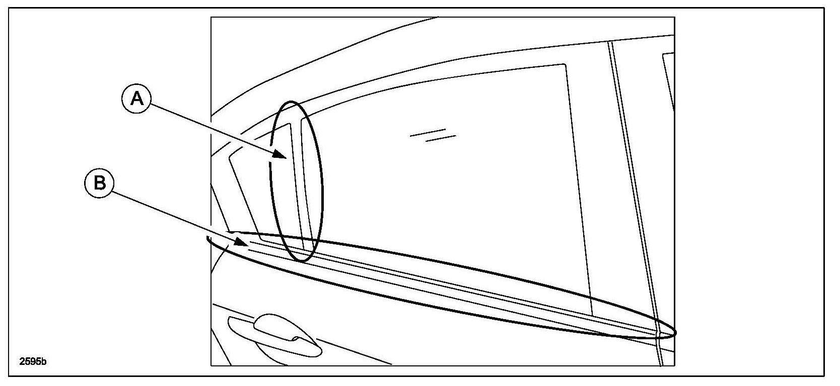 2. Replace the rear door glass guide (A) with a new one and the rear beltline molding (B) with a modified one. Refer to MS3 online instructions or Workshop Manual section 09-12 REAR DOOR GLASS REMOVAL/INSTALLATION and 09-16 REAR BELTLINE MOLDING REMOVAL/INSTALLATION.