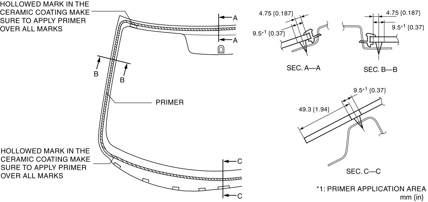 6. Apply glass primer on the glass as shown in the figure, then allow it to dry for approx. 30 min.