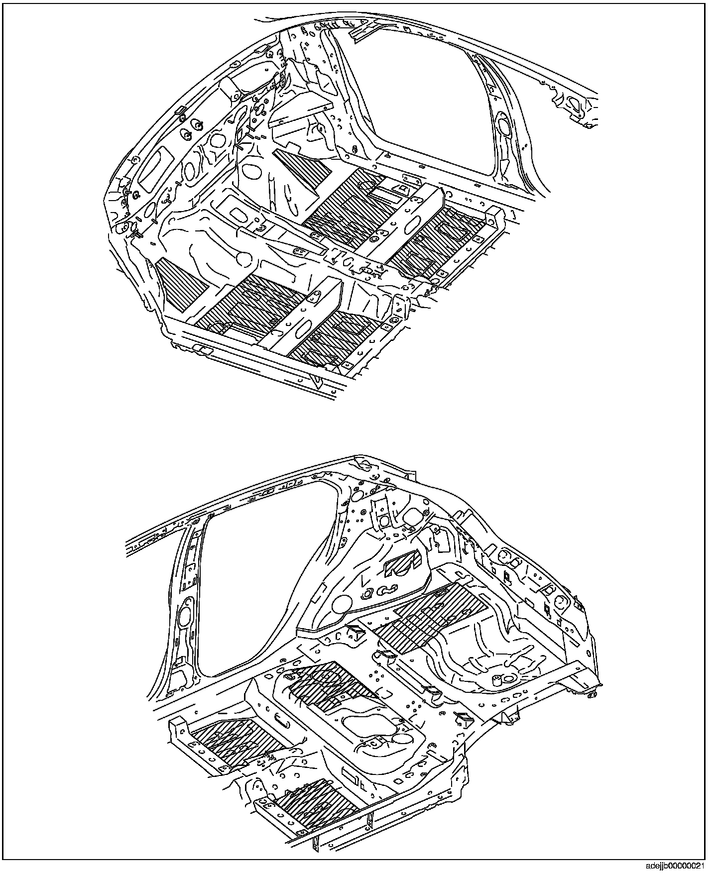 After repairing the body, attach the dumping sheet to the location shown in the figure for noise insulation.
