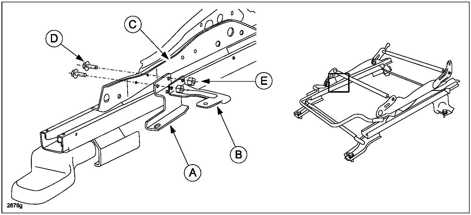 Mazda3: Attach the spring bracket (A) and the original bracket (B) together to the seat frame (C) with the two screws (D) and nuts (E) as shown.