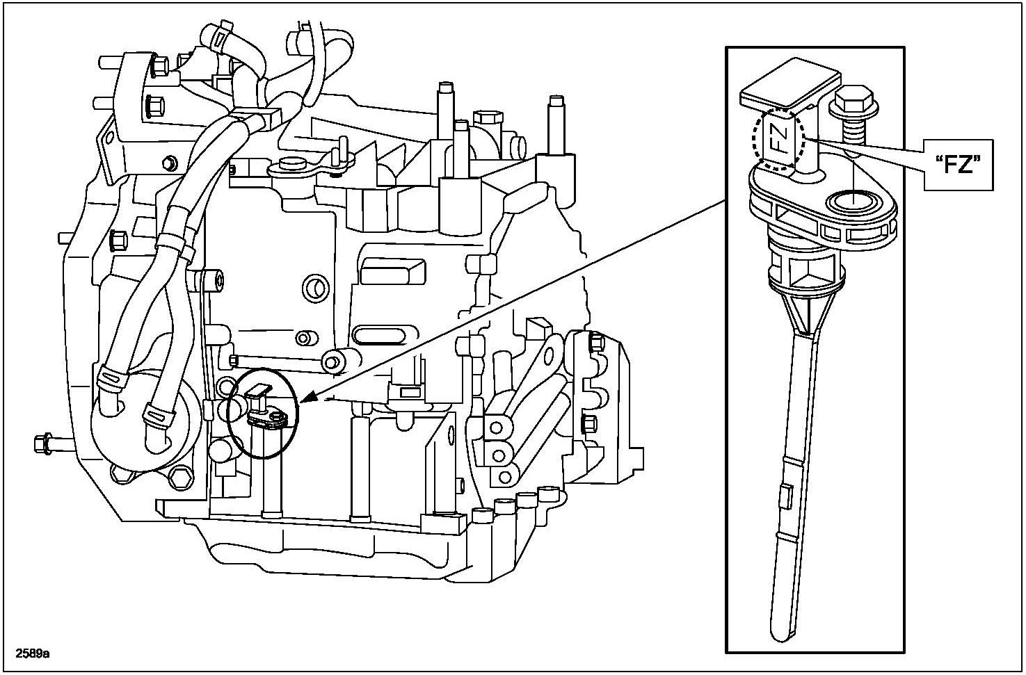 To check the fluid level, remove the bolt, then remove the dipstick. The dipstick is marked with a "FZ" on SKYACTIV-DRIVE FW6A-EL AT. When finished, insert the dipstick and install the bolt.