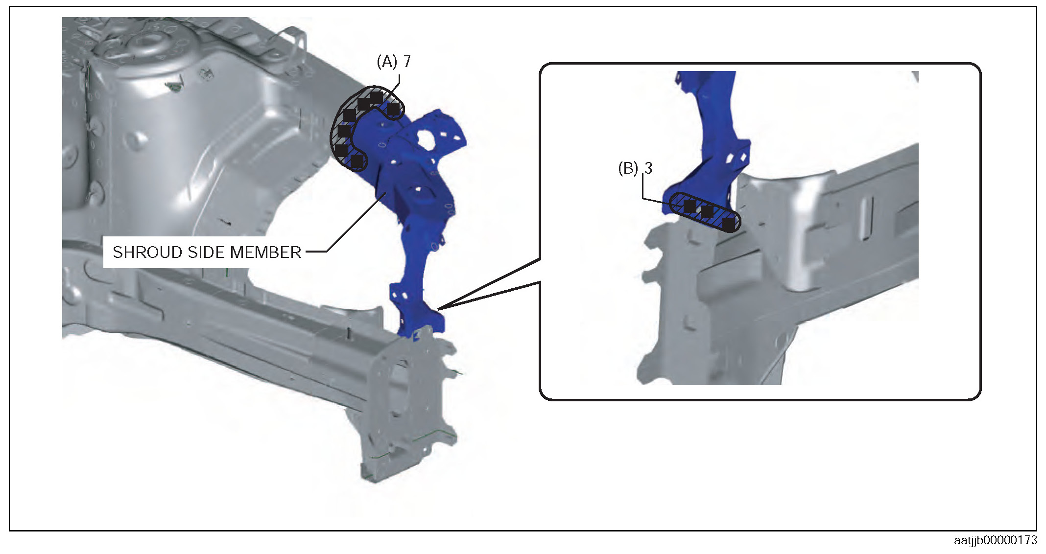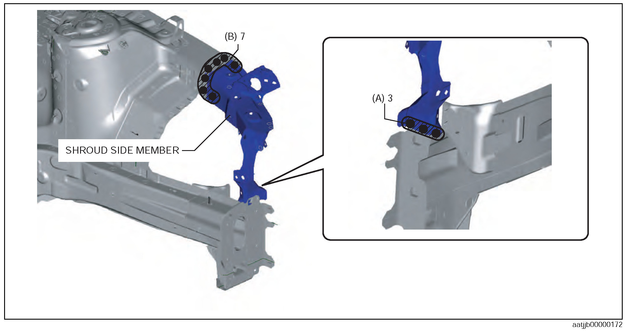 5. Plug weld the 3 locations indicated by (B) shown in the figure, then install the shroud side member.