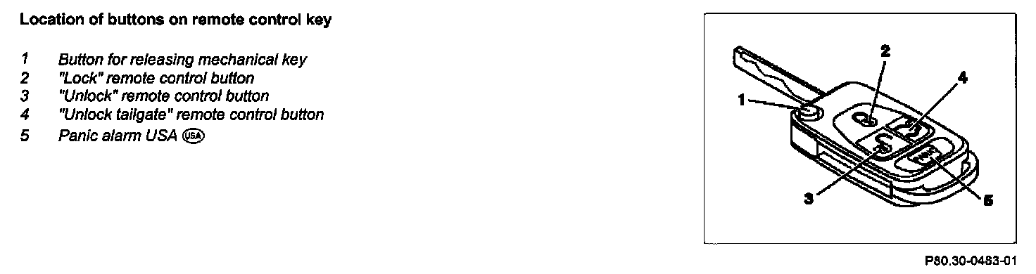 When a button on the remote control key is pressed the key sends a radio signal to the all-activity module (AAM) (N10). This signal contains the alternating code and the key number for identification the remote control key as well as the instruction to be executed. The alternating code and key number are stored in the remote control key transponder.